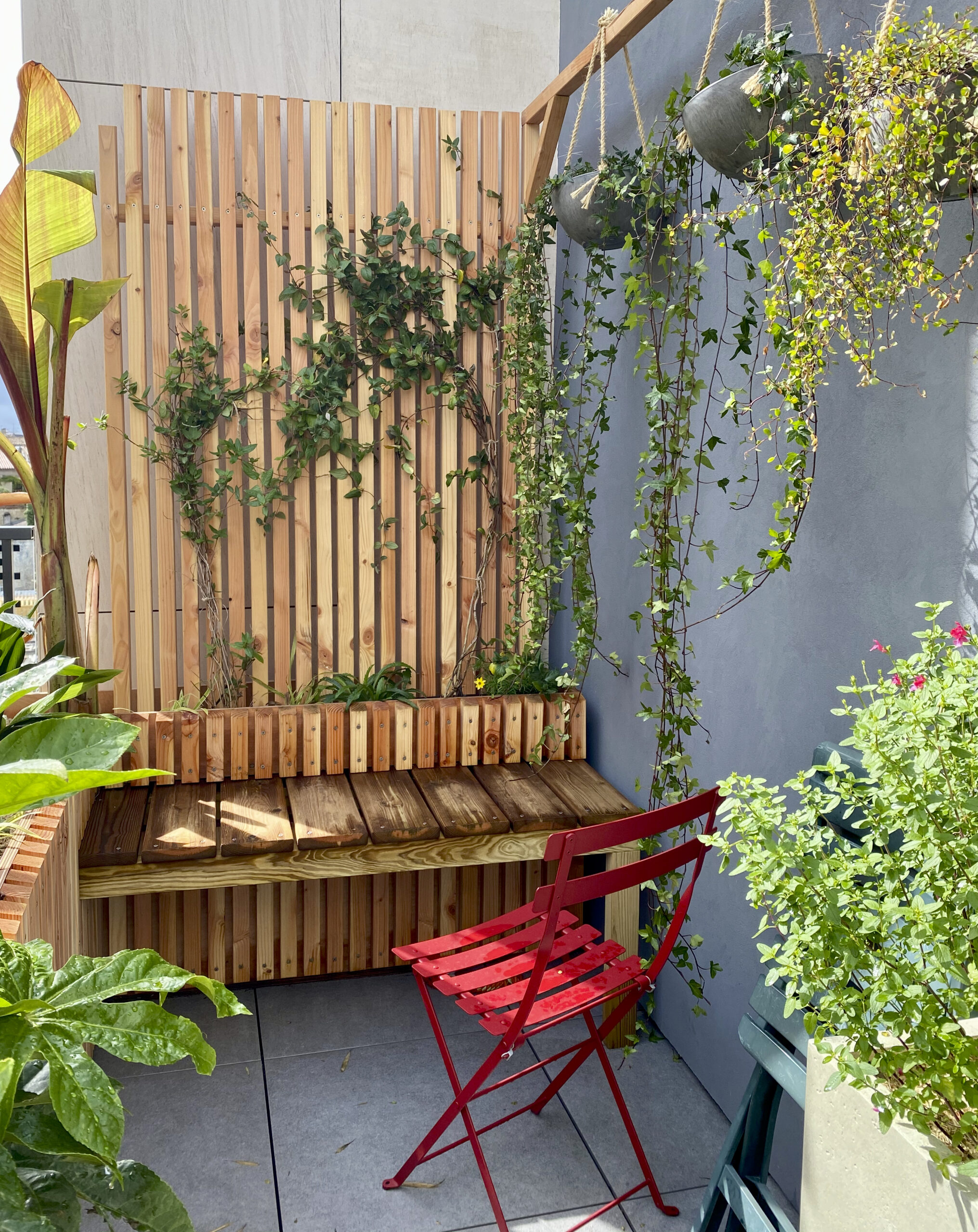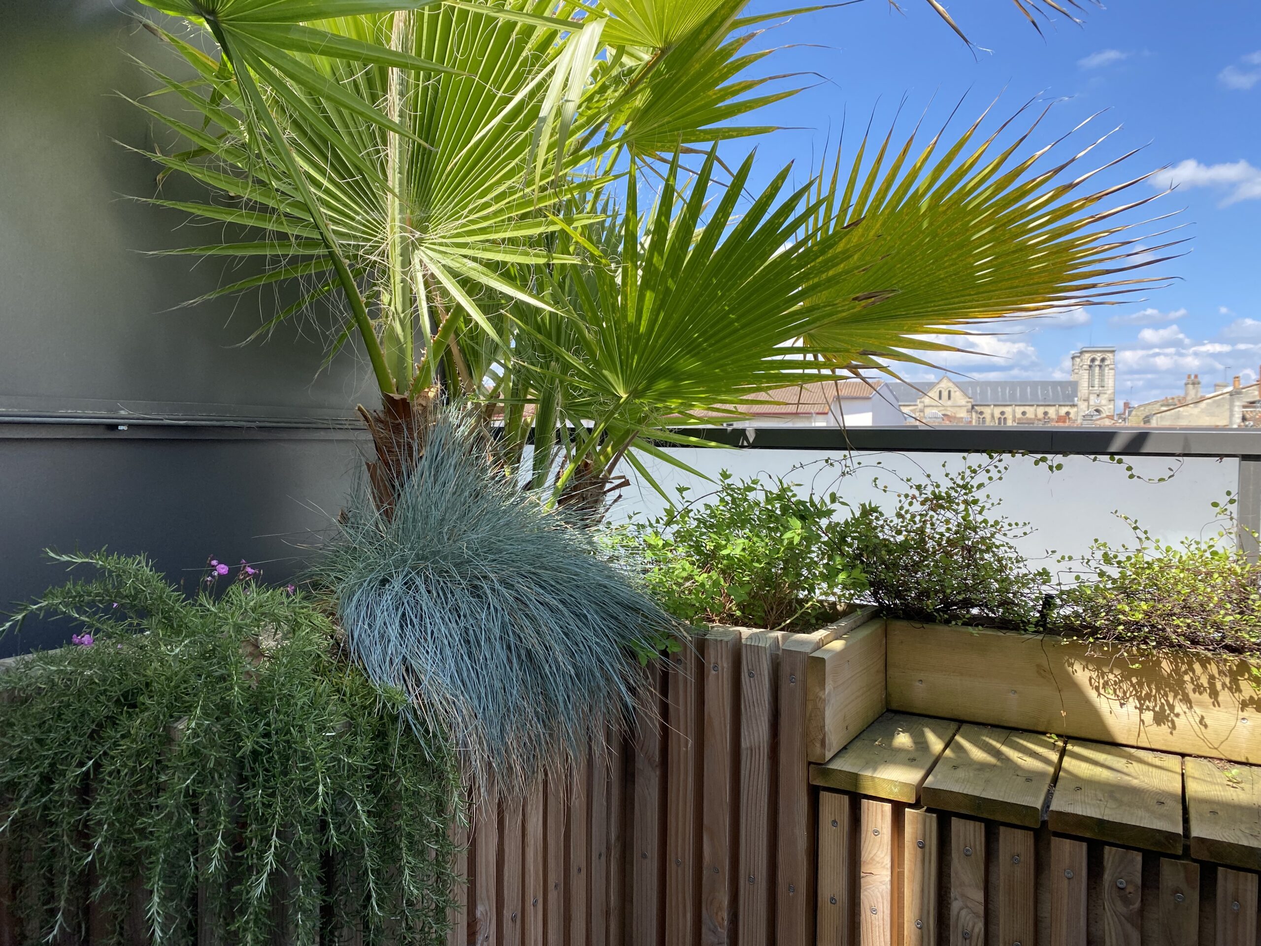 Grâce à cet aménagement, créé totalement sur-mesure, nos clients peuvent aujourd’hui bénéficier de deux écrins de verdure. La terrasse toute en longueur permet de circuler facilement tout en profitant d’une végétation dense qui laisse passer la lumière et résiste à la sécheresse. Le balcon quant à lui, est devenu le lieu idéal pour se détendre et profiter d’un bon livre à l’ombre des plantes et à l’abri des regards.