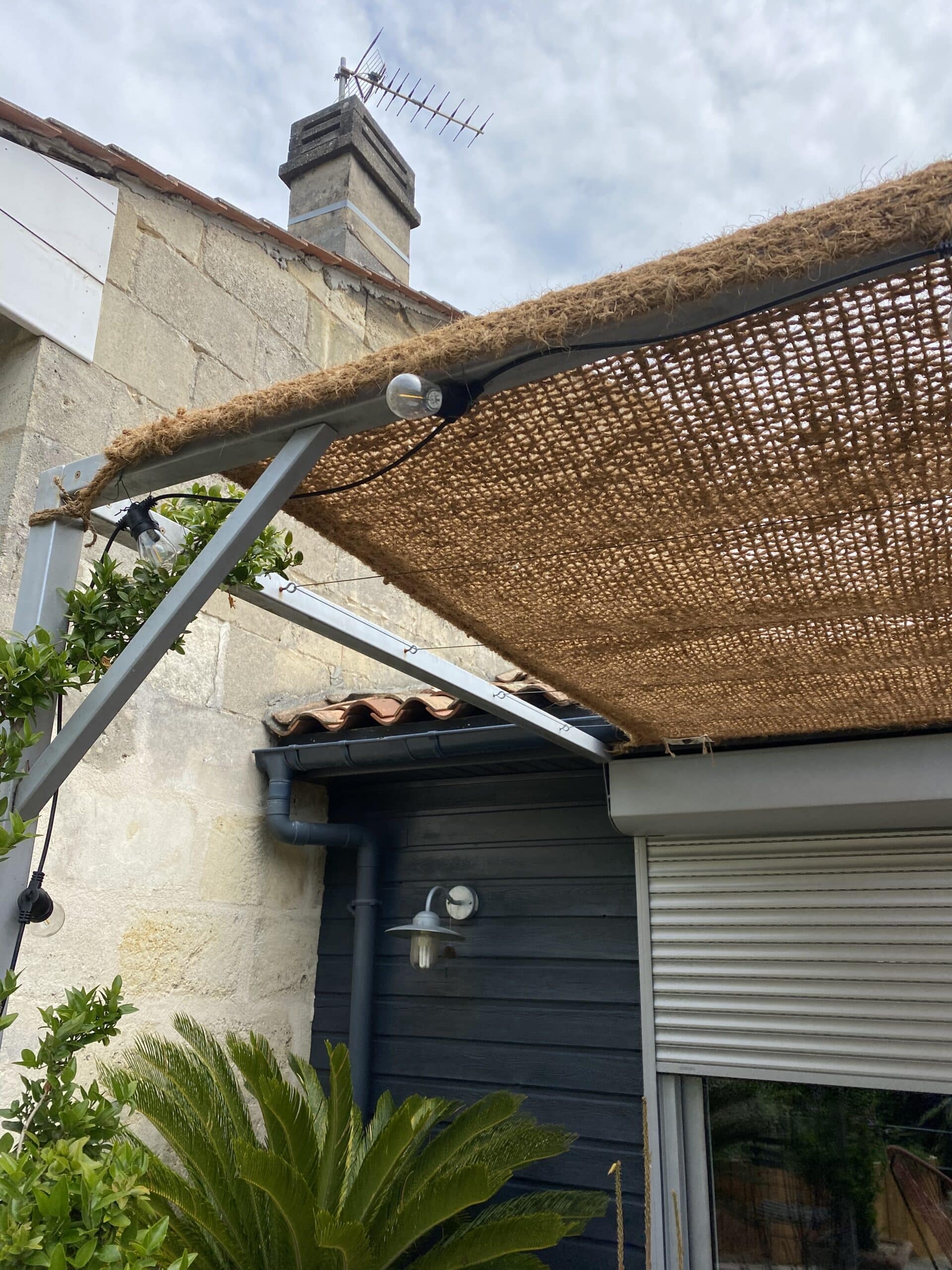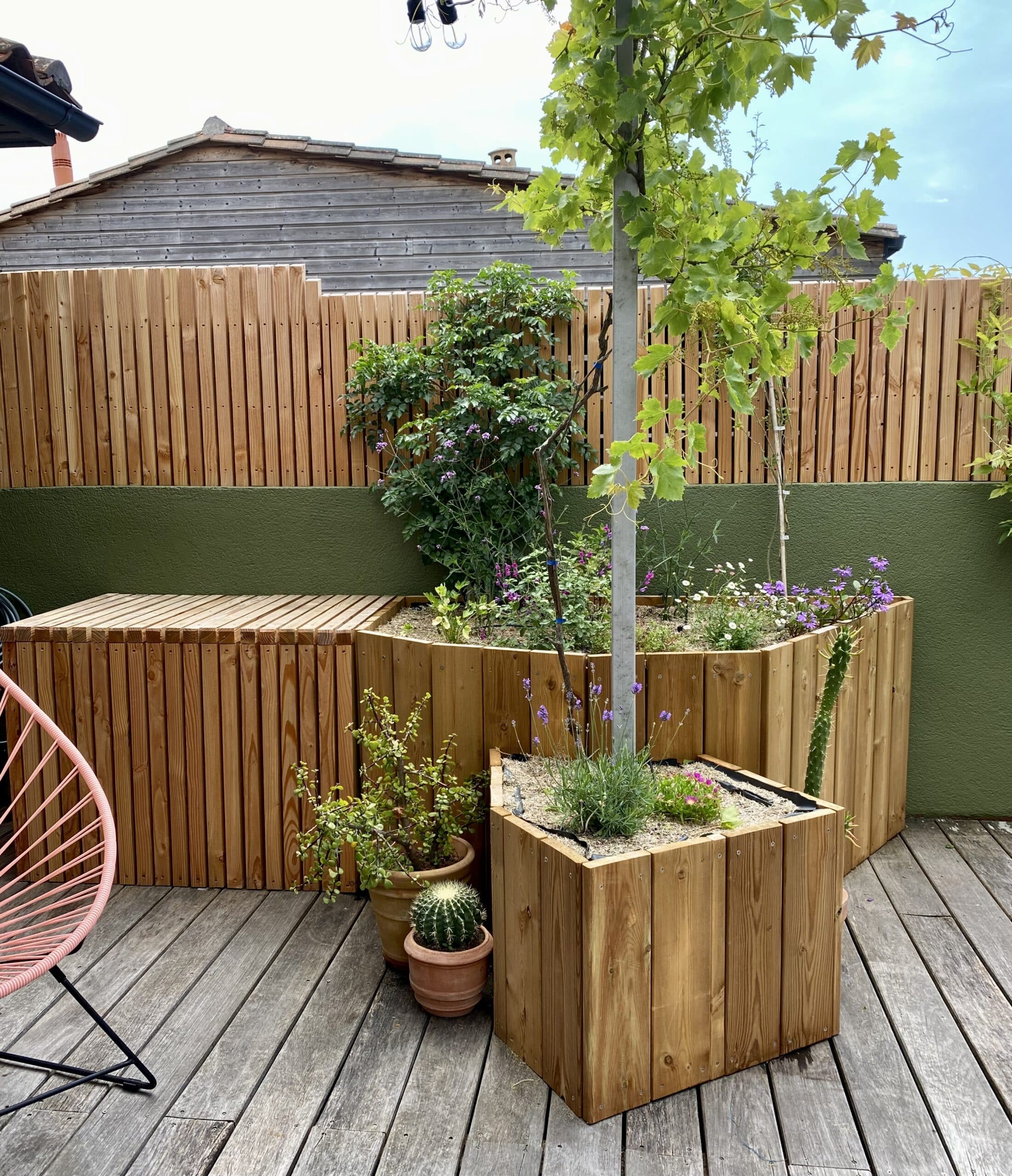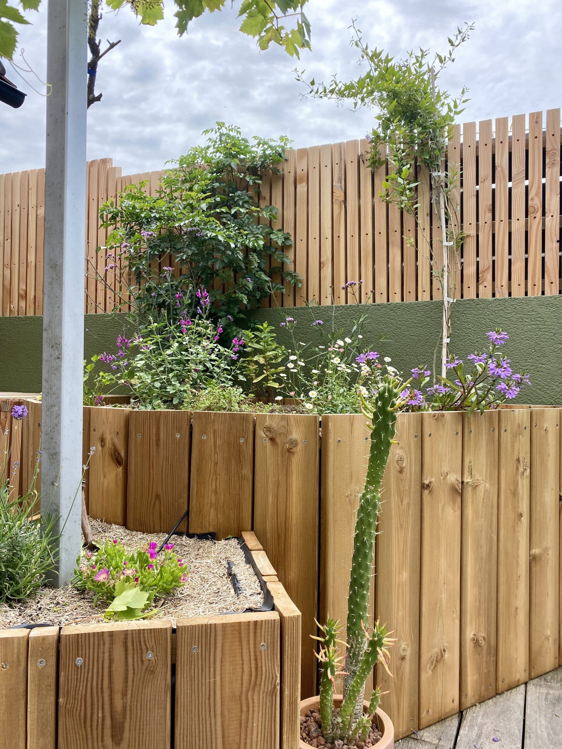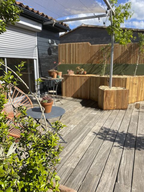 Création des jardinières sur mesures, création du cache pompe à chaleur, mise en terre des jardinières, fourniture et pose d’une ombrière, arrosage automatique : 4500€