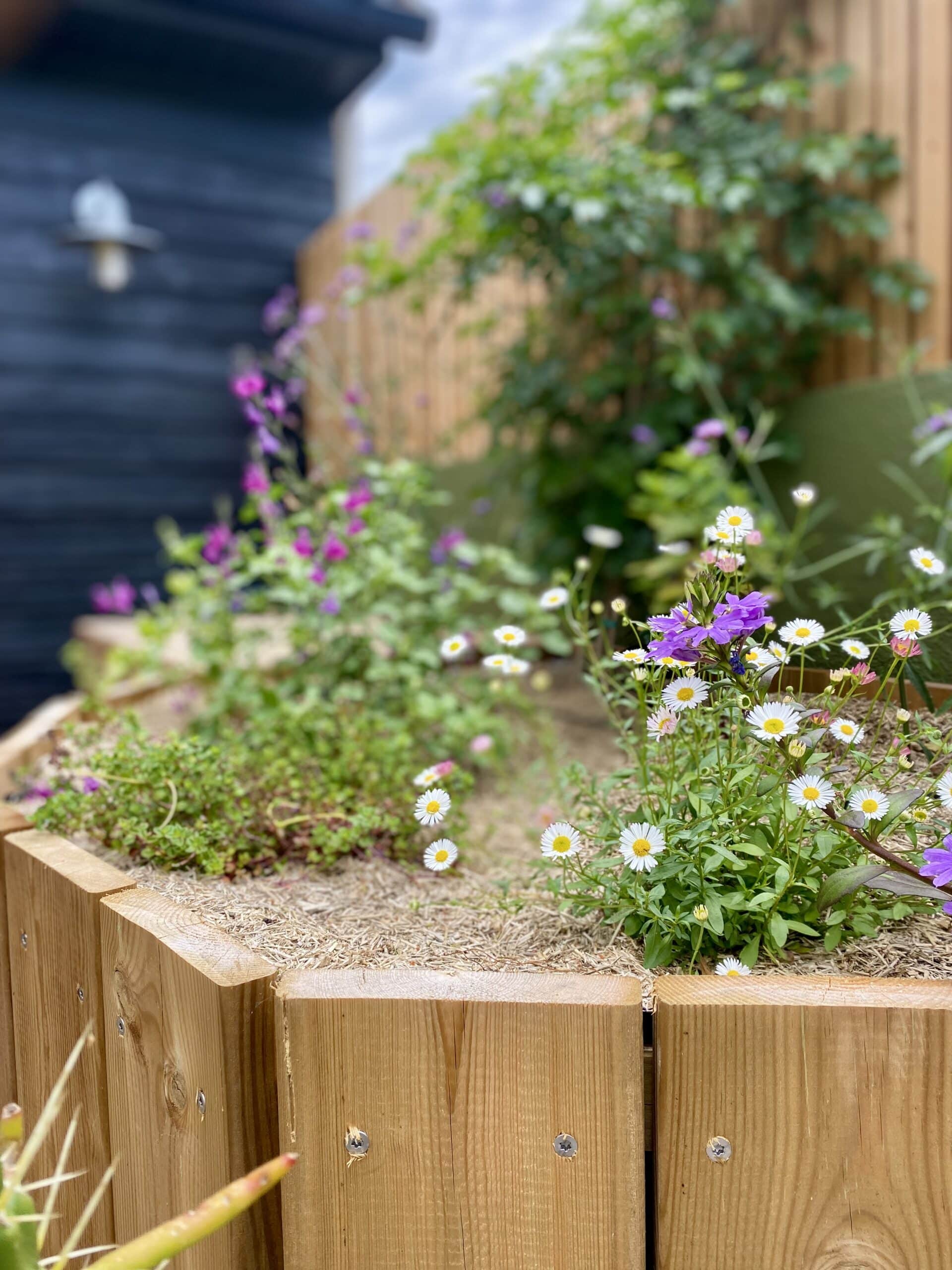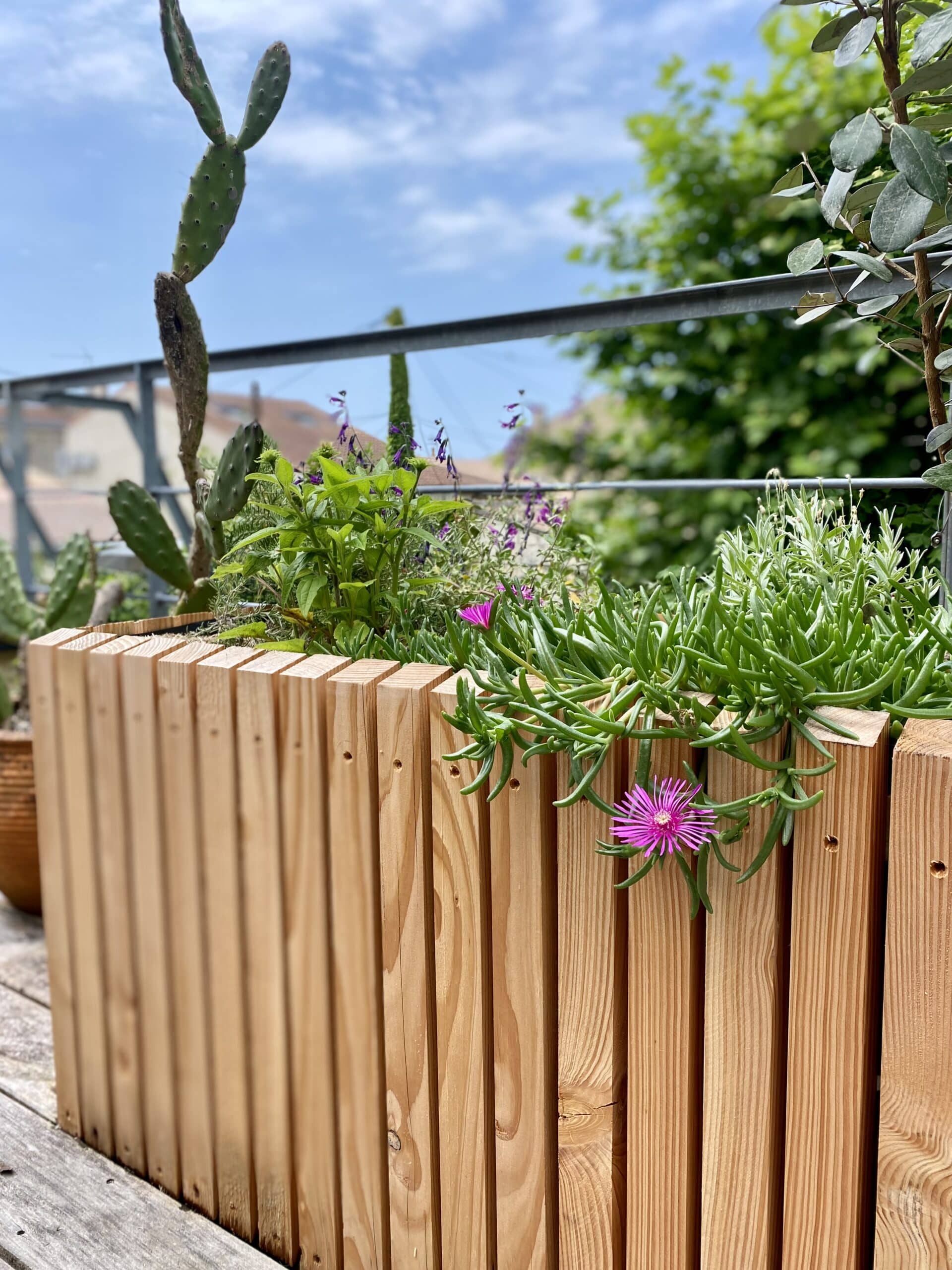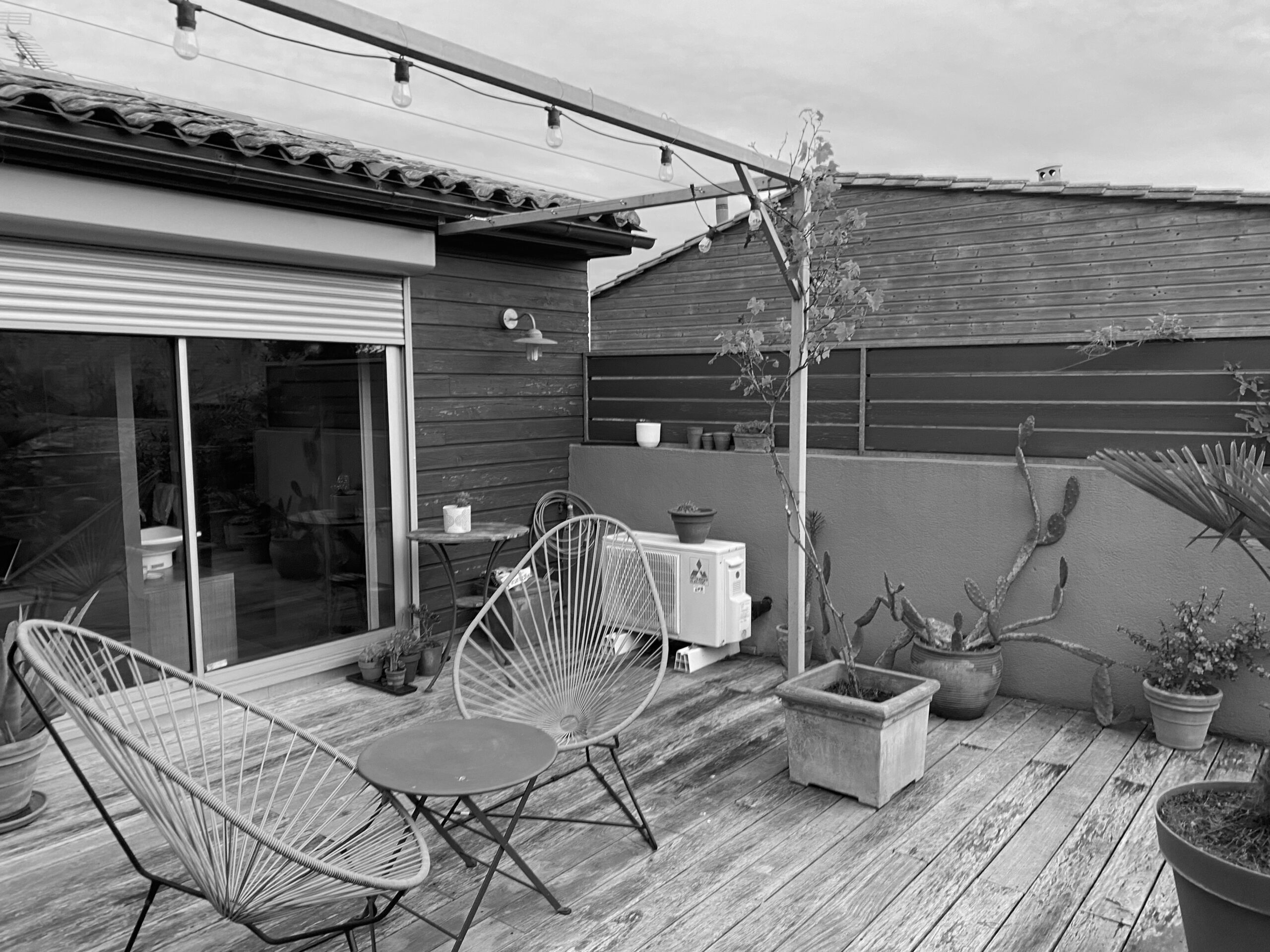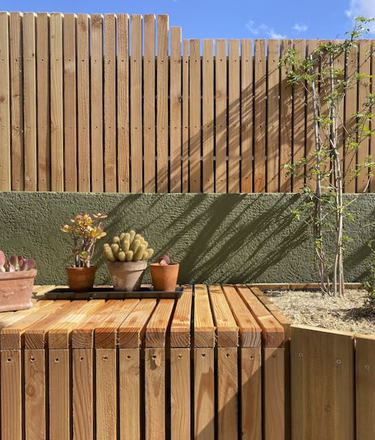 Création des jardinières sur mesures, création du cache pompe à chaleur, mise en terre des jardinières, fourniture et pose d’une ombrière, arrosage automatique : 4500€