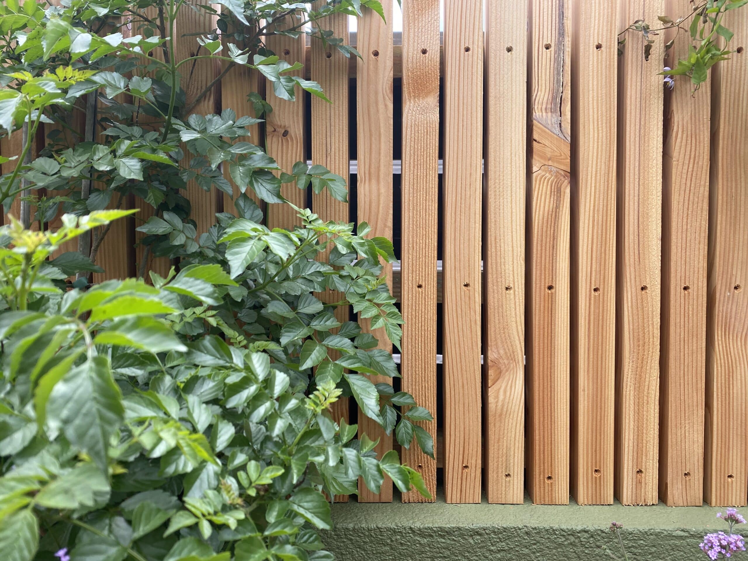 Le brise vu sur deux niveaux abritent la terrasse des regard mais apporte également du rythme par les trames des tasseaux.